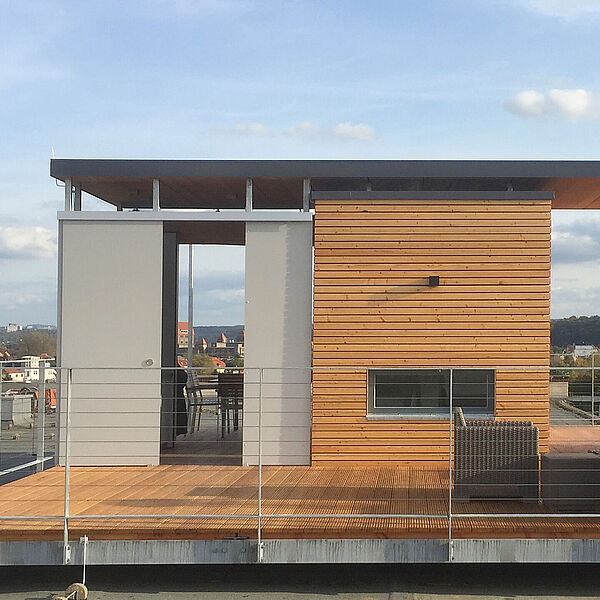 Für eine Loftwohnung, in einem ehemaligen Fabrikgebäude in Heidenau, wurde auf dem Flachdach eine großzügige Dachterrasse geschaffen.